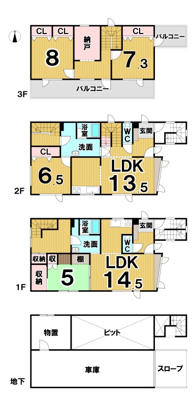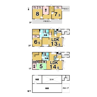 | 間取り | 4SLDK1階:LDK14.5帖 和室5帖 / 2階:LDK13.5帖 洋室6.5帖 / 3階:洋室8帖 洋室7.3帖 S4帖 |