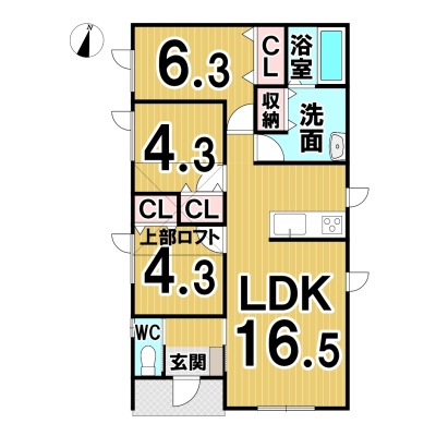 | 間取り | 3LDK1階:LDK16.5帖 洋室6.3帖 洋室4.3帖 洋室4.3帖 |