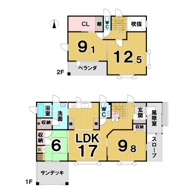| 間取り | 4LDK1階:LDK17帖 和室6帖 洋室9.8帖 / 2階:洋室9.1帖 洋室12.5帖 |