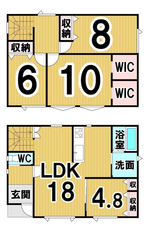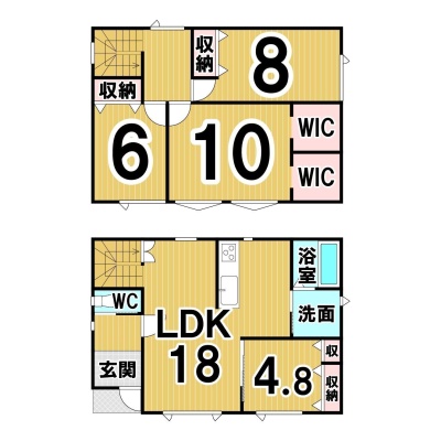 | 間取り | 4LDK1階:LDK18帖 洋室4.8帖 / 2階:洋室6帖 洋室10帖 洋室8帖 |