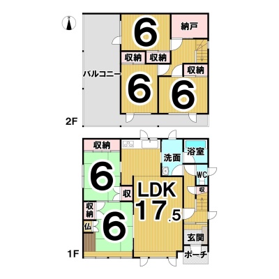 | 間取り | 5LDK1階:LDK17.5帖 和室6帖 和室6帖 / 2階:洋室6帖 洋室6帖 洋室6帖 S3帖 |