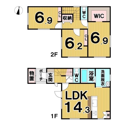 | 間取り | 3LDK1階:LDK14.3帖 / 2階:洋室6.9帖 洋室6.2帖 洋室6.9帖 |