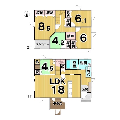 | 間取り | 5SLDK1階:LDK18帖 和室4.5帖 / 2階:洋室8.5帖 和室4.2帖 洋室6.1帖 洋室6帖 S1.5帖 |