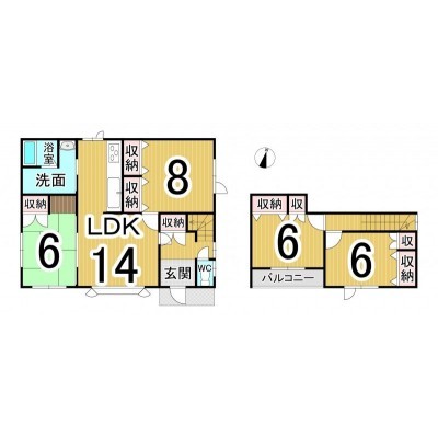 | 間取り | 4LDK1階:LDK14帖 洋室8帖 和室6帖 / 2階:洋室6帖 洋室6帖 |