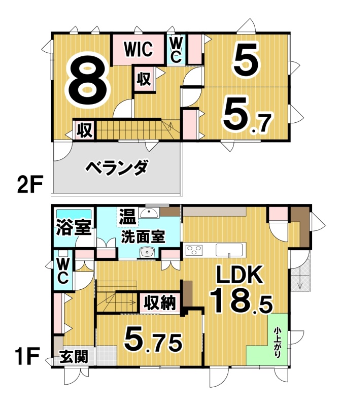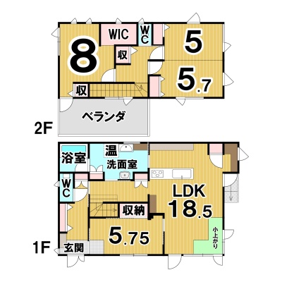 | 間取り | 4LDK1階:LDK18.5帖 洋室5.75帖 / 2階:洋室5帖 洋室5.7帖 洋室8帖 |