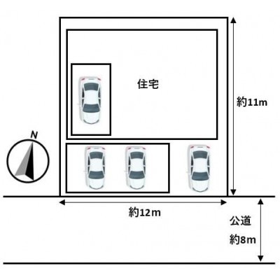 【区画図】駐車場はカーポートに2台横付で1台、車庫に1台の合