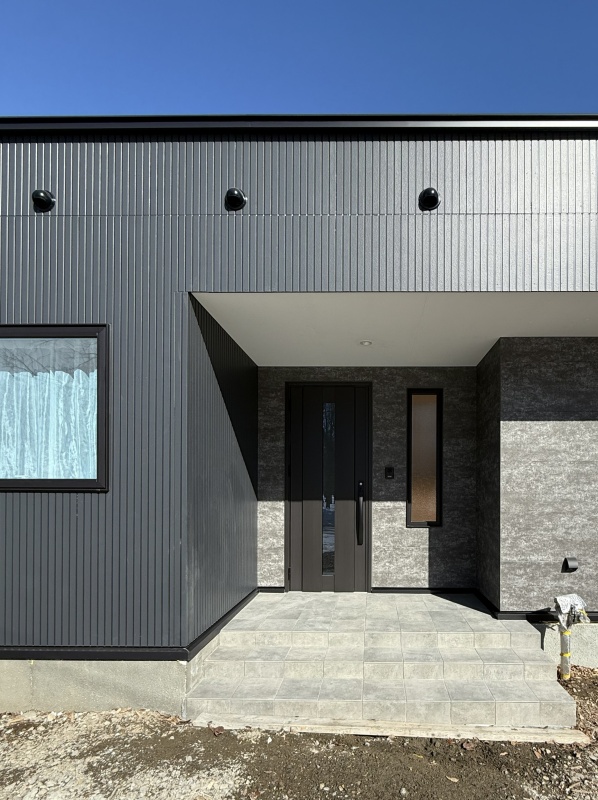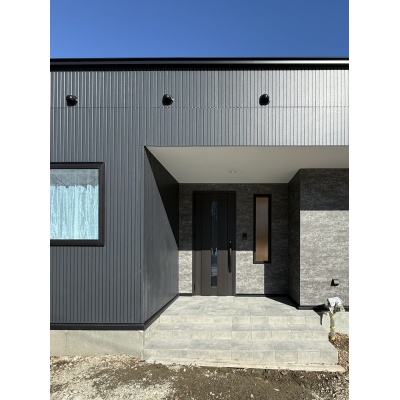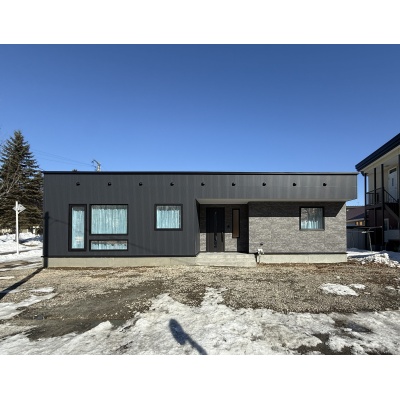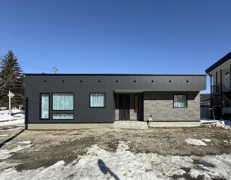 【外観】南西角地に位置するブラックで統一感のある平屋