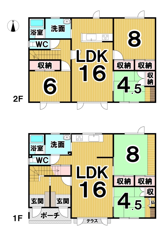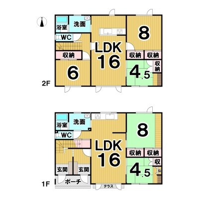 | 間取り | 5LDK1階:LDK16帖 和室8帖 和室4.5帖 / 2階:LDK16帖 洋室6帖 洋室8帖 和室4.5帖 |