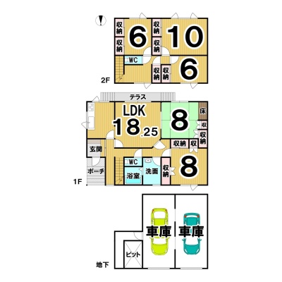 | 間取り | 5LDK1階:LDK18.2帖 和室8帖 洋室8帖 / 2階:洋室6帖 洋室10帖 洋室6帖 |