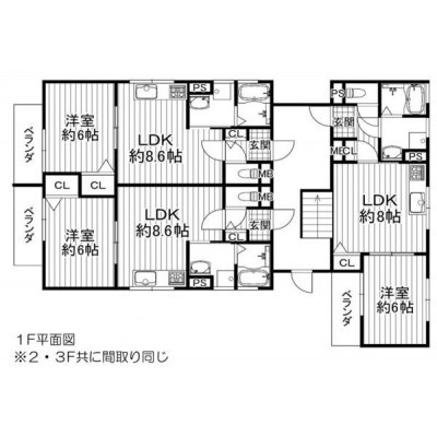| 面積 | 建物:303.24m² (91.73坪)/ 土地:195.53m² (59.14坪) 専有:最小32m² (9.68坪)~最大33m² (9.98坪) |