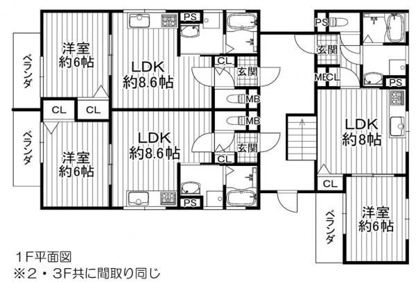 | 面積 | 建物:303.24m² (91.73坪)/ 土地:195.53m² (59.14坪) 専有:最小32m² (9.68坪)~最大33m² (9.98坪) |