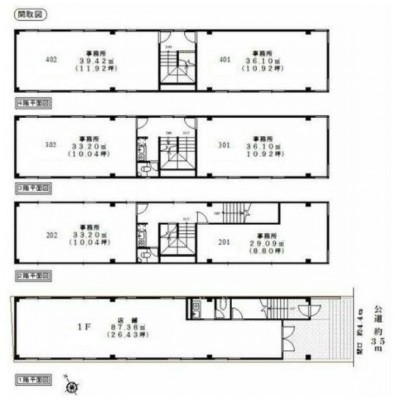 | 面積 | 建物:303.3m² (91.74坪)/ 土地:100.61m² (30.43坪)(公簿) 専有:最小29.09m² (8.79坪)~最大87.38m² (26.43坪) |