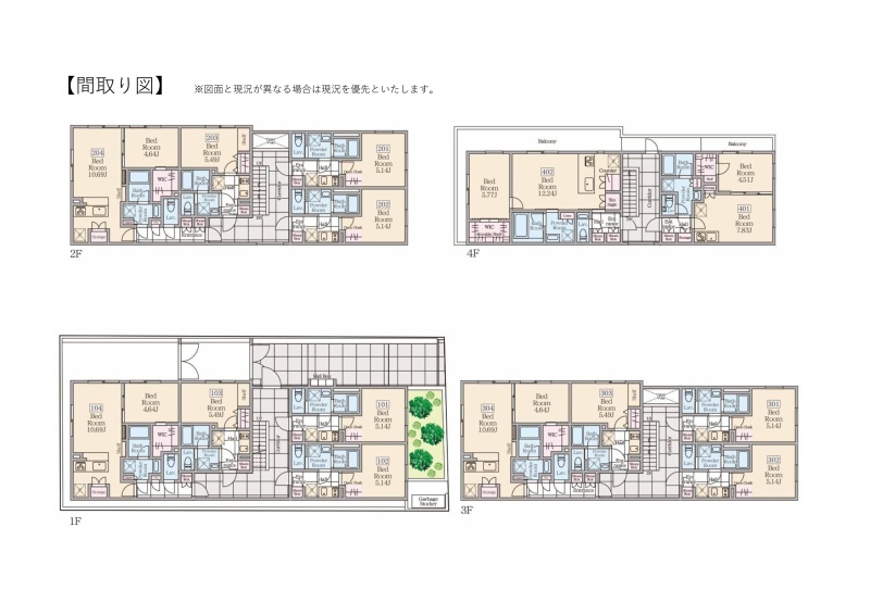 | 面積 | 建物:426.24m² (128.93坪)/ 土地:202.63m² (61.29坪)(公簿)※セットバック済み 専有:最小19.05m² (5.76坪)~最大44.11m² (13.34坪) |