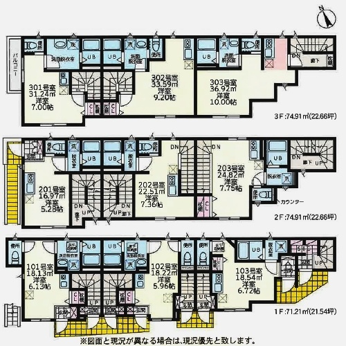 | 面積 | 建物:221.03m² (66.86坪)/ 土地:119.18m² (36.05坪) 専有:最小16.97m² (5.13坪)~最大36.92m² (11.16坪) |