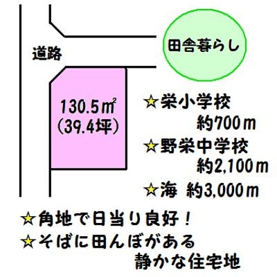 ここに注目!栄小学校約700m!野栄中学校約2,100m、海まで約3,000m。 静かな住宅街。目の前には田んぼがあります。