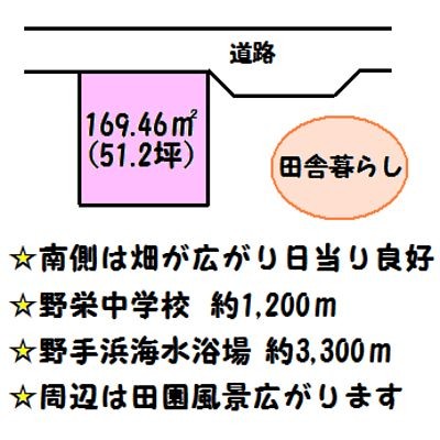 ここに注目!南側畑で日当り良好!!田園風景広がりとても長閑!野栄中学校約1,200m、海まで約3,300m