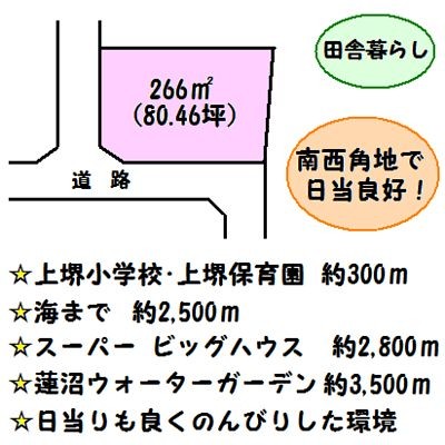 ここに注目!南西角地で日当り良好!上堺小学校と保育園約300m!!海まで約2,500m、スーパー約2,800m、家族で楽しめる蓮沼ウォーターガーデン約3,500m。静かな環境です。