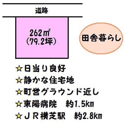 ここに注目!値下げ!650万円→500万円(H23.6.9) ほどよく広い79坪の土地。のんびりと家庭菜園しながらの田舎暮らし。東陽病院約1.5km、横芝駅約2.8km。