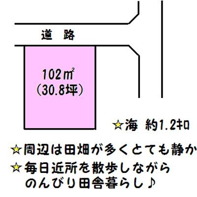 ここに注目!田んぼがすぐそばにあり、とても静かで田舎暮らしにおすすめ。海まで約1.2キロ、豊海小学校約700m。