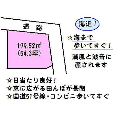 ここに注目!ゆるやかなカーブの道に接する54坪の土地。海まで歩いてすぐ!日当り良好!東側は田んぼがあり、海の風や田んぼからの風が心地よいです。