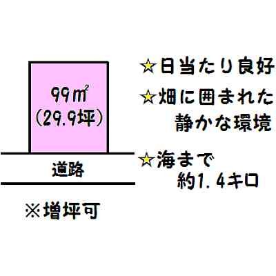 ここに注目!日当たり良好!畑の多い静かな環境。平成19年9月造成工事済み。海まで約1.4キロ。
