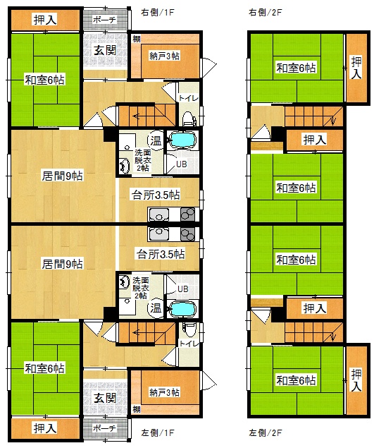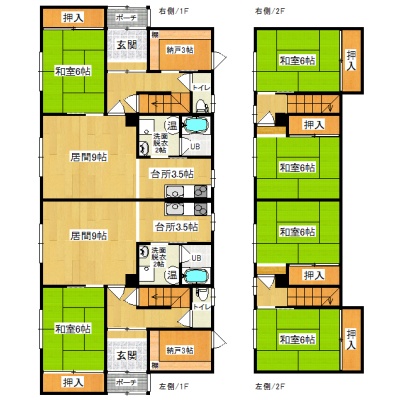 建物の階建 地上2階建 構造 木造 間取り 3DK1階:L9帖 K3.5帖 和室6帖 / 2階:和室6帖 和室6帖 駐車場 あり 駐車場台数:2台各2台縦列可