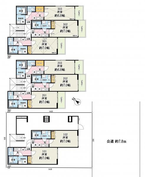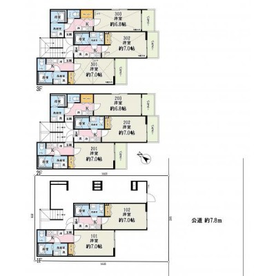 建物の階建 地上3階建 間取り 1K / K 駐車場 接道状況 一方 - 南側幅7.80mの公道に9.00m接道