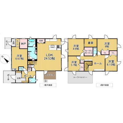 | 間取り | 5LDK1階:LDK24.5帖 洋室10.8帖 S2.2帖 / 2階:洋室8.6帖 S3帖 洋室5.7帖 洋室6.1帖 洋室8帖 |