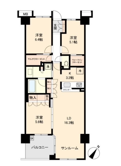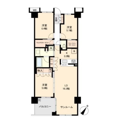 3LDK(81.3m²)└ 1階:LD16.3帖 K3.2帖 洋室6.4帖 洋室5.6帖 洋室5.1帖