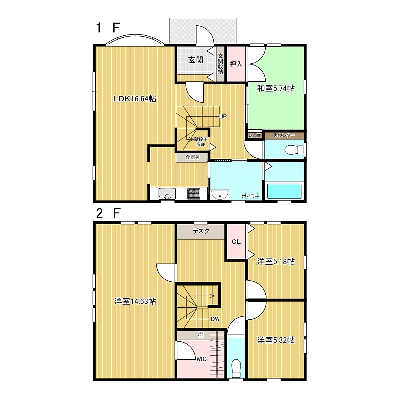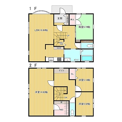 | 間取り | 4LDK1階:LDK16.64帖 和室5.74帖 / 2階:洋室14.63帖 洋室5.18帖 洋室5.32帖 |