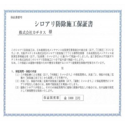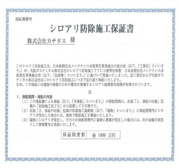 シロアリ防除には5年間の保証付き(施工日から。施工箇所のみ施