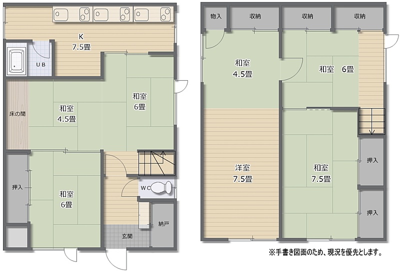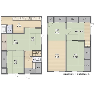 | 間取り | 5LDK1階:和室6帖 和室6帖 和室4.5帖 / 2階:洋室11.5帖 和室7.5帖 和室6帖 |