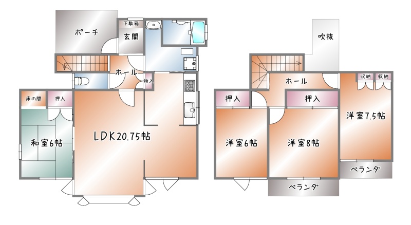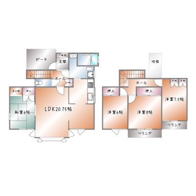 | 間取り | 4LDK1階:LDK20.75帖 和室6帖 / 2階:洋室8帖 洋室7.5帖 洋室6帖 |