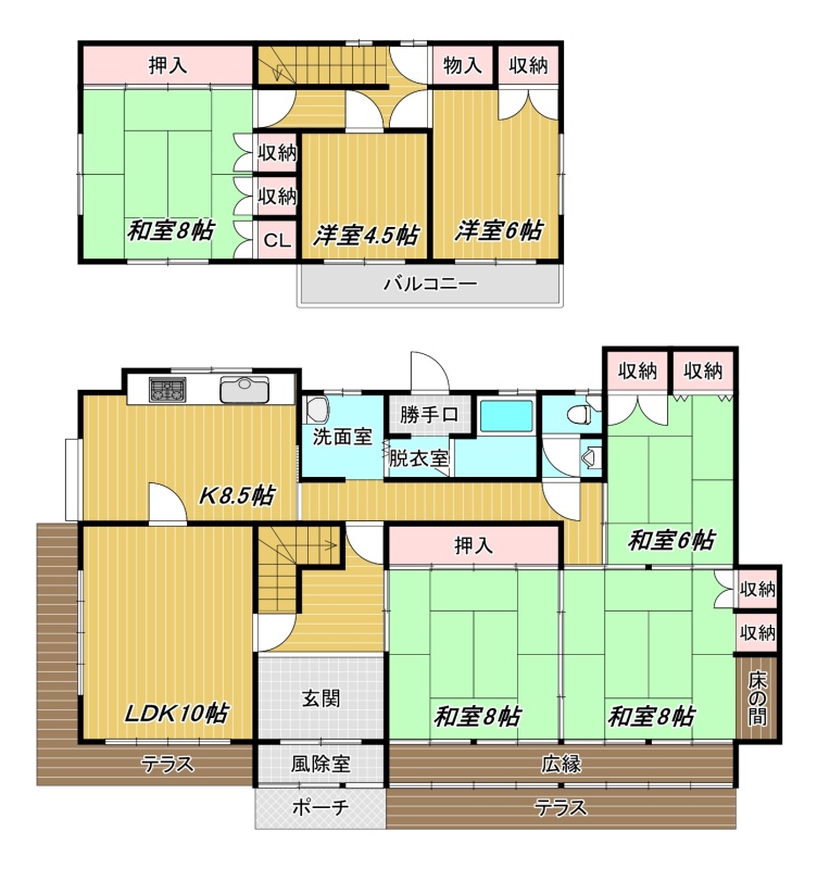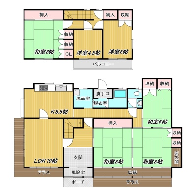 | 間取り | 6LDK1階:L10帖 K8.5帖 和室8帖 和室8帖 和室6帖 / 2階:洋室6帖 洋室4.5帖 和室6帖 |