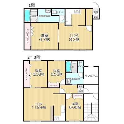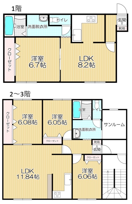 1階:1LDK 2階から3階:3LDK