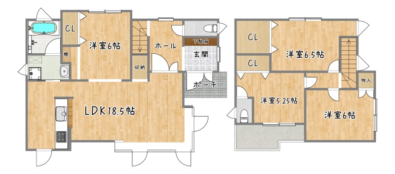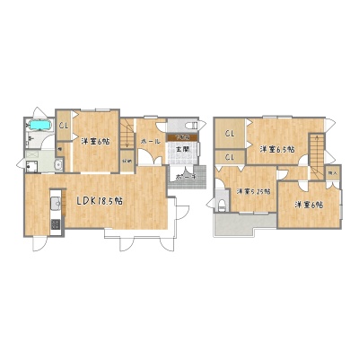 | 間取り | 4LDK1階:LDK18.5帖 洋室6帖 / 2階:洋室6.5帖 洋室6帖 洋室6帖 |
