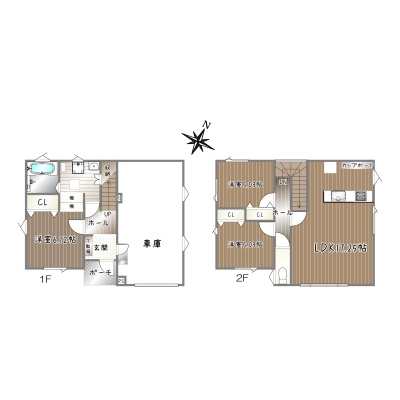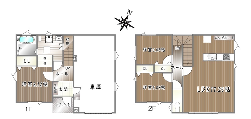| 間取り | 3LDK1階:洋室6.12帖 / 2階:LDK17.25帖 洋室5.03帖 洋室5.03帖 |