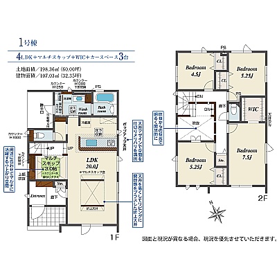 | 間取り | 4LDK2階:洋室4.5帖 洋室5.25帖 洋室5.25帖 洋室7.5帖 / その他:LDK20帖 |