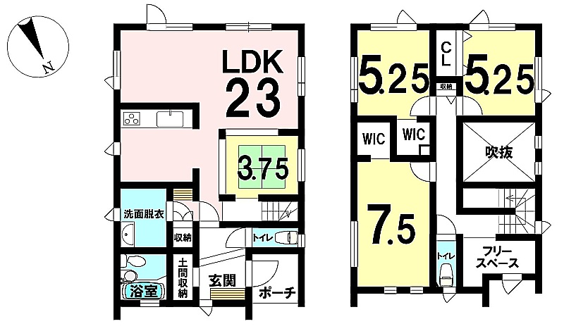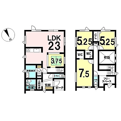 | 間取り | 3LDK1階:LDK23帖 / 2階:洋室5.2帖 洋室5.2帖 洋室7.5帖 |