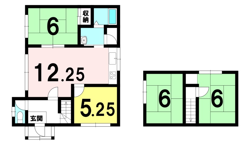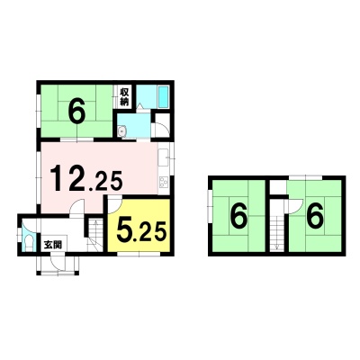 | 間取り | 4LDK1階:LDK12.25帖 和室6帖 洋室5.2帖 / 2階:和室6帖 和室6帖 |