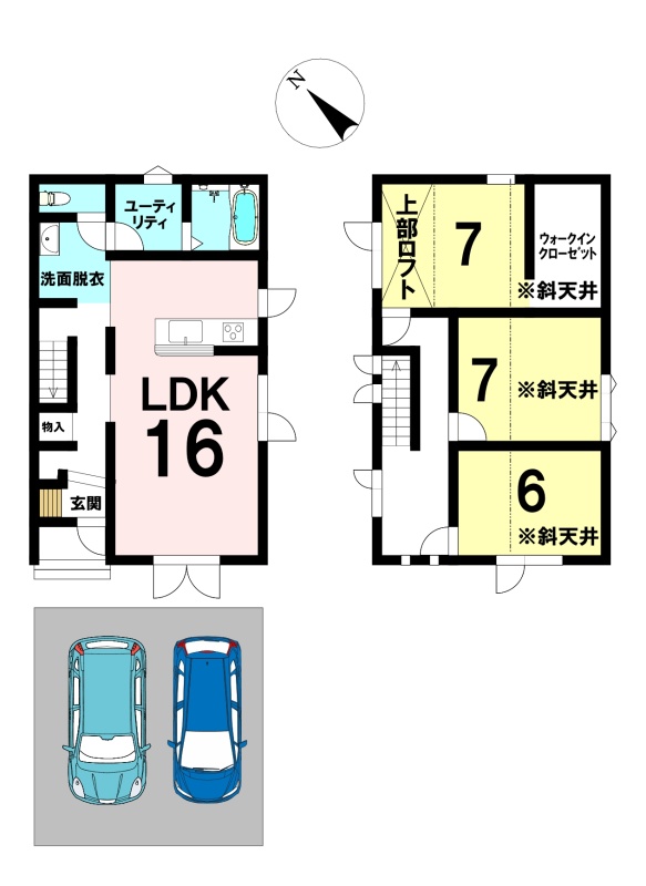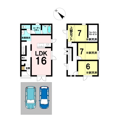 | 間取り | 3LDK1階:LDK16帖 / 2階:洋室7帖 洋室7帖 洋室6帖 |