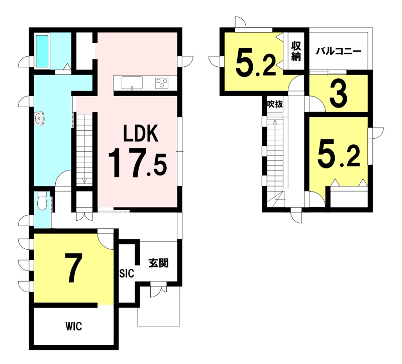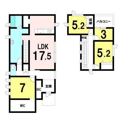 | 間取り | 4LDK1階:LDK17.5帖 洋室7帖 / 2階:洋室5.2帖 洋室5.2帖 洋室3帖 |