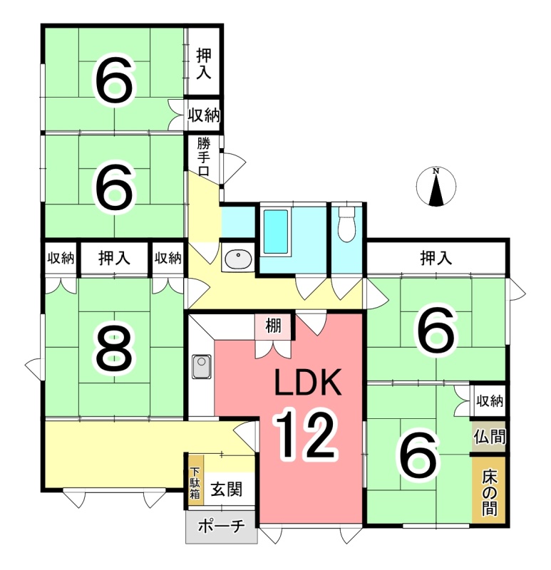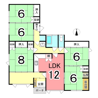 | 間取り | 5LDK1階:LDK12帖 和室6帖 和室6帖 和室6帖 和室6帖 和室8帖 |