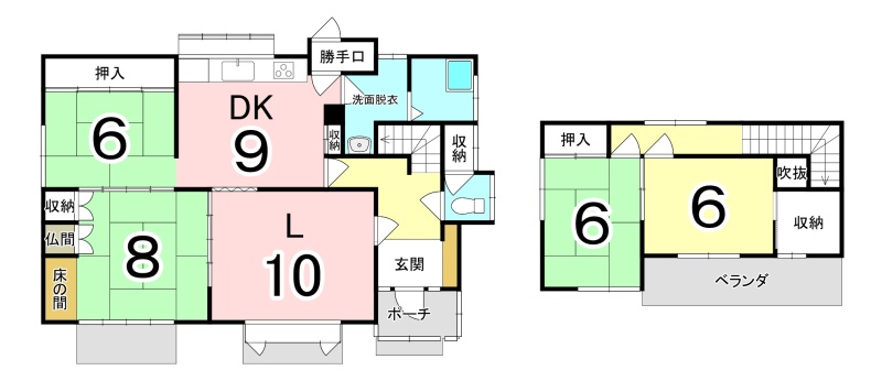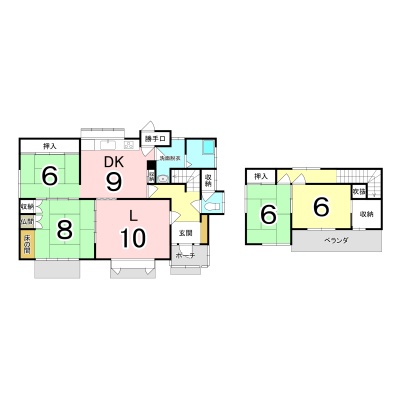 | 間取り | 4LDK1階:LD10帖 K9帖 和室8帖 和室6帖 / 2階:和室6帖 洋室6帖 |
