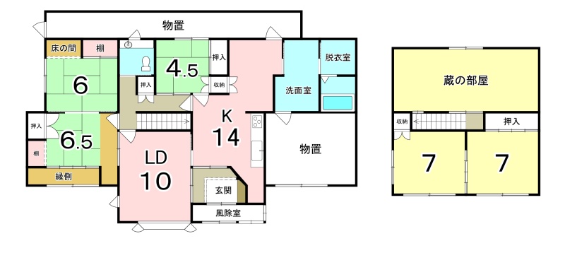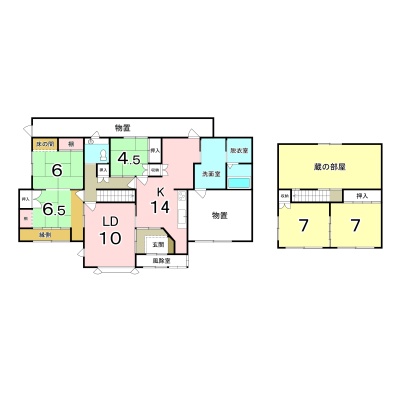 | 間取り | 5LDK1階:LD10帖 K14帖 和室6帖 和室6.5帖 和室4.5帖 / 2階:和室7帖 洋室7帖 |
