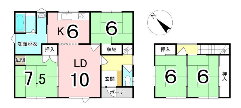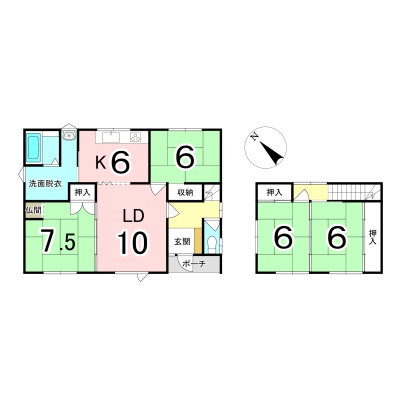 | 間取り | 4LDK1階:LD10帖 K6帖 和室7.5帖 和室6帖 / 2階:和室6帖 和室6帖 |