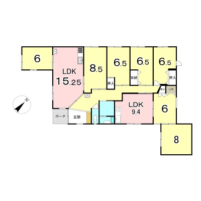 | 間取り | 二世帯型1階:LDK15.2帖 洋室6帖 洋室8.5帖 洋室6.5帖 洋室6.5帖 洋室6.5帖 洋室9.4帖 洋室6帖 洋室8帖 |