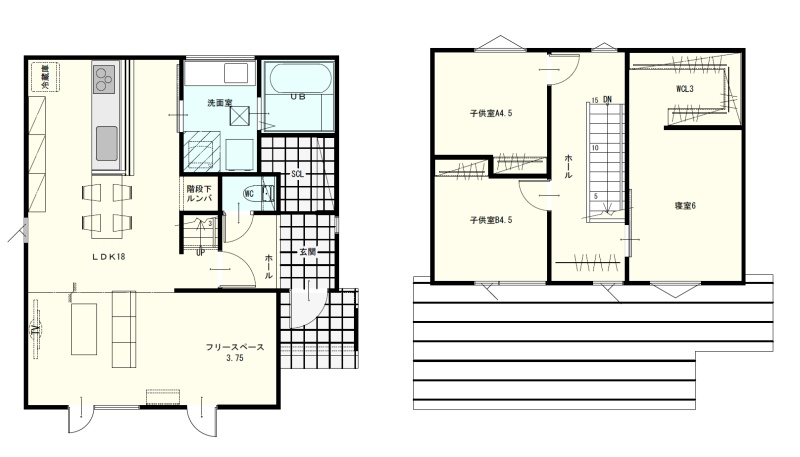 | 間取り | 3LDK1階:LDK18帖 / 2階:洋室6帖 洋室4.5帖 洋室4.5帖 |