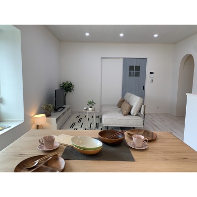 淡いブルーの引戸とアーチが印象的。