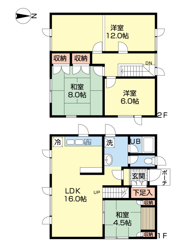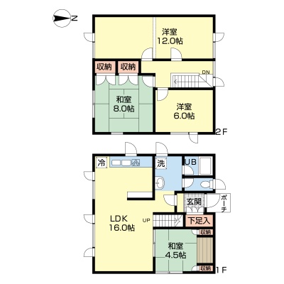 | 間取り | 4LDK1階:LDK16帖 和室4.5帖 / 2階:洋室12帖 洋室6帖 和室8帖 |
